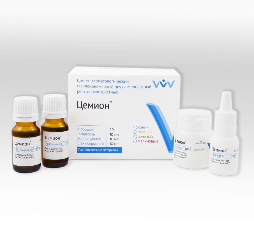 Стеклоиономерный универсальный цемент химического отверждения используется для реставрации полостей молочных зубов 1 и 2 класса. Обладает высокими адгезивными характеристиками. Поставляется в виде порошка – алюмосиликатного стекла и жидкости – полиакриловой кислоты. Цемион-колор обладает антикариозными и бактерицидными свойствами, рентгеноконтрастен. Обеспечивает надёжное краевое прилегание.